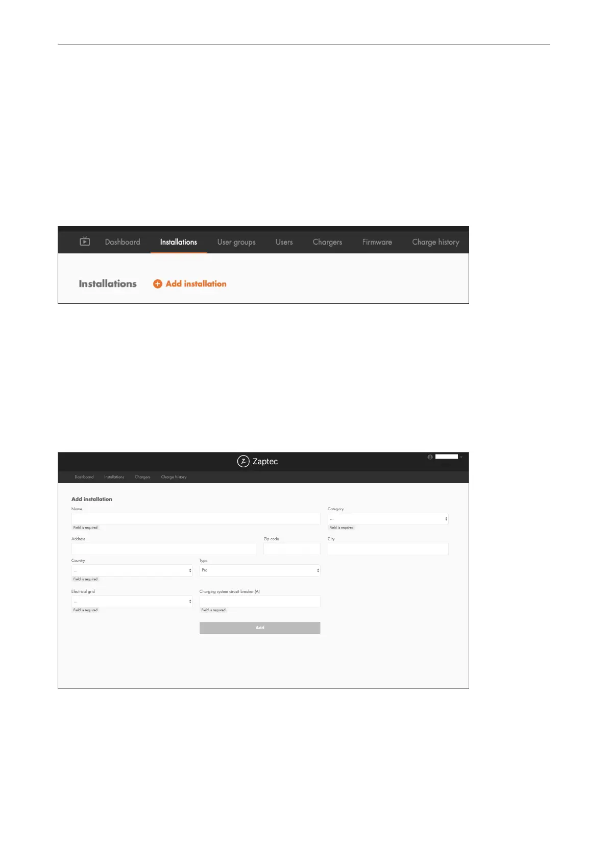 ZaptecPortal-installation, skal du gå til Installationer og udfylde