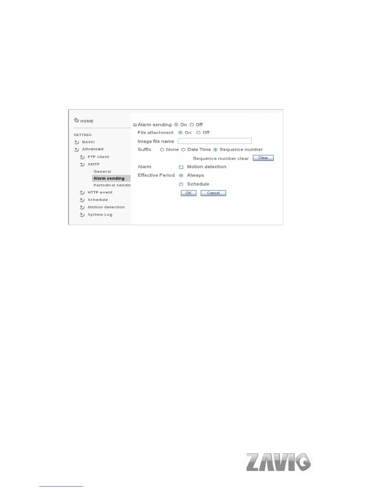Alarm sending: Select On to set to send mail with connection to the alarm