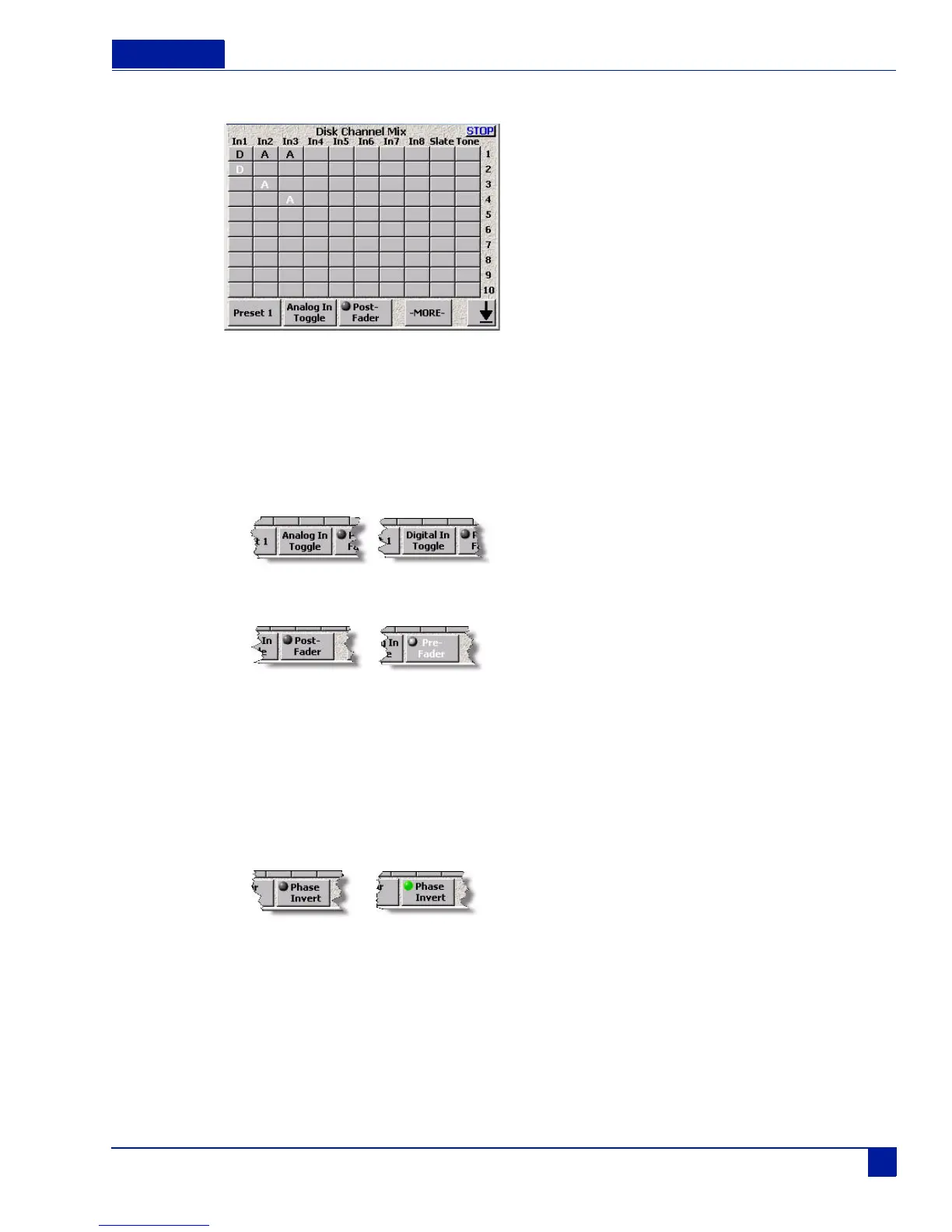 Each track can have an input be pre- or post-fader, or have the input’s phase inverted. This can be done for