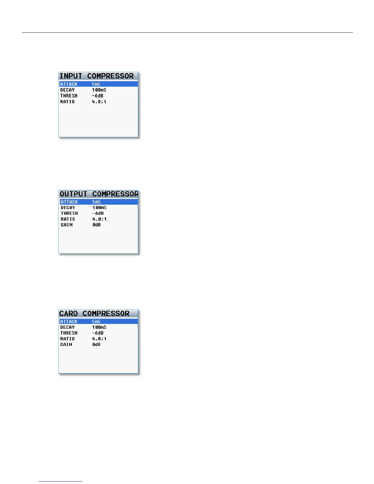 This menu sets the parameters for the input compressor. The Input Compressor settings are global, meaning