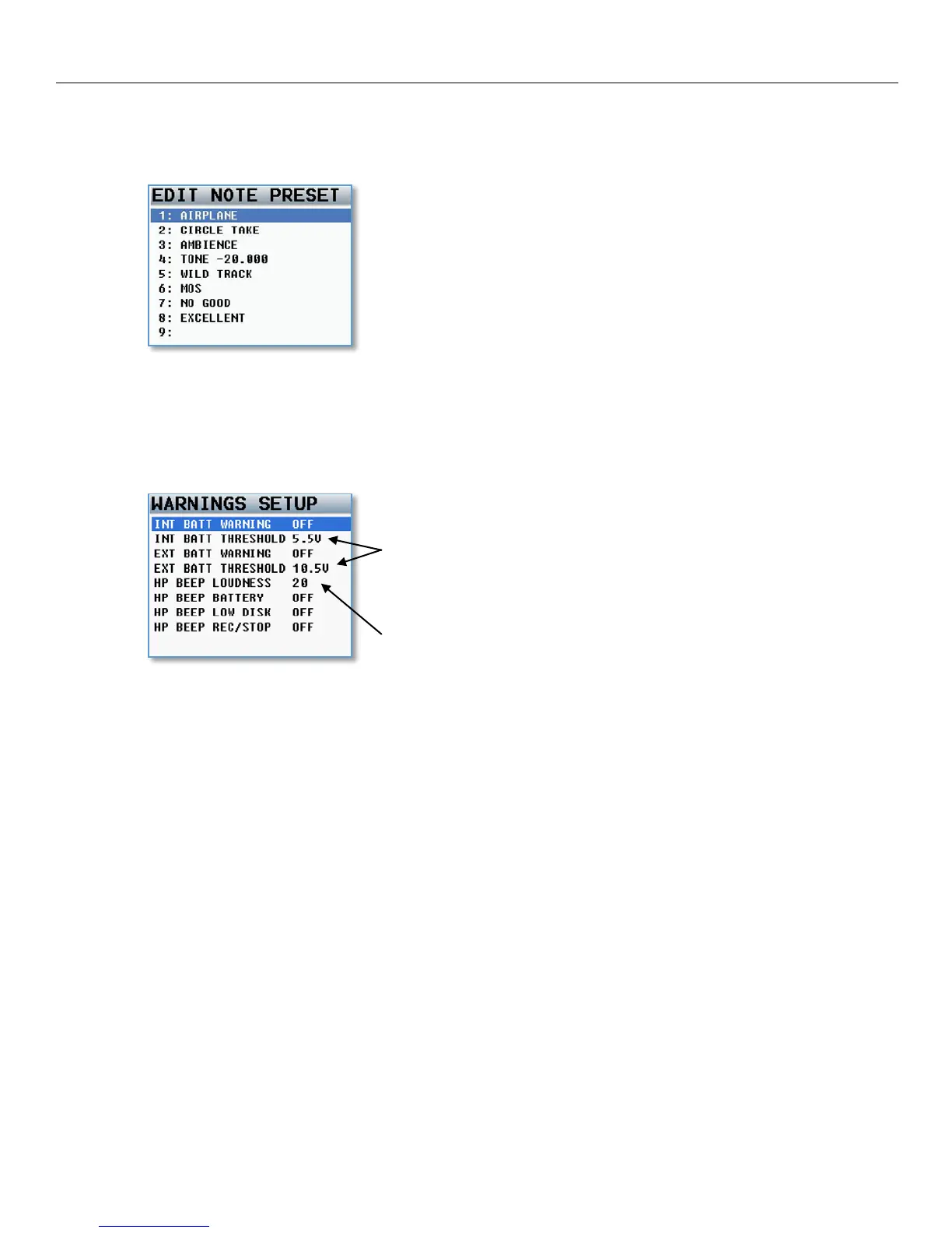 The warning setup menu manages the audible alerts that are sent to the main headphones. These warnings will