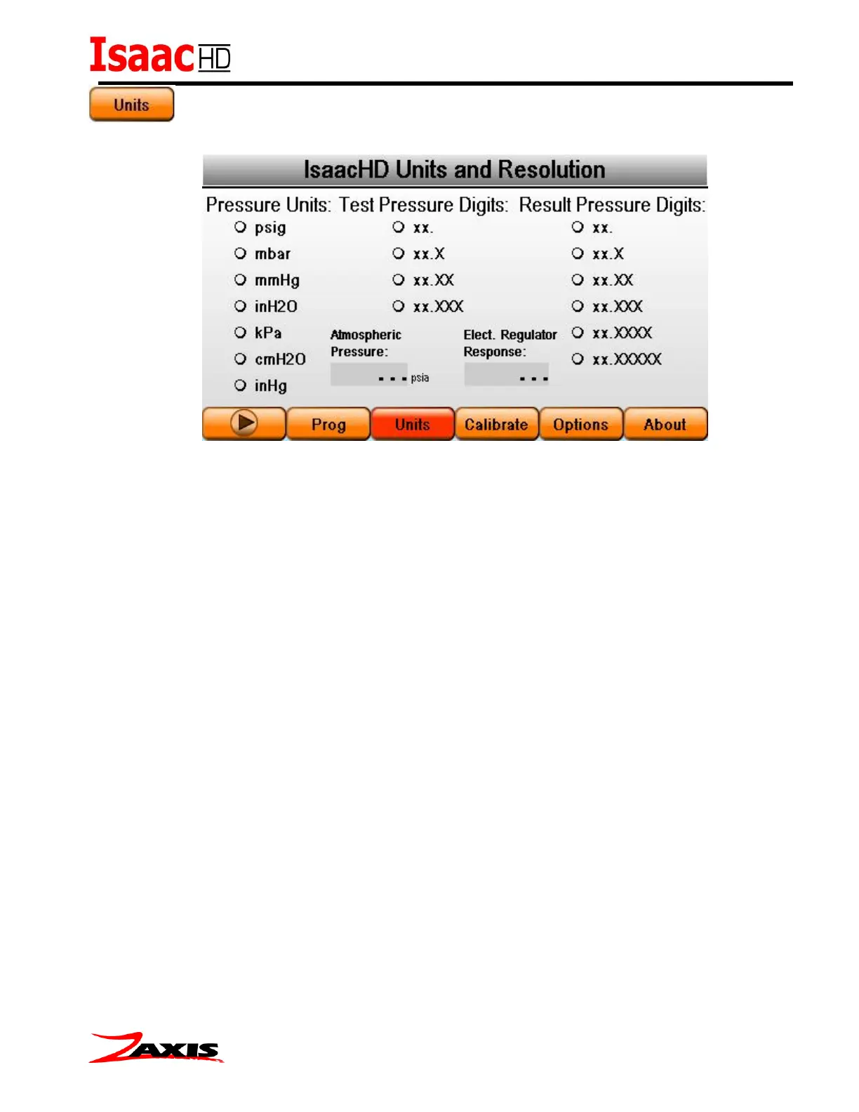 Test Pressure and Result Pressure resolution can be modified by selecting the appropriate radio button.