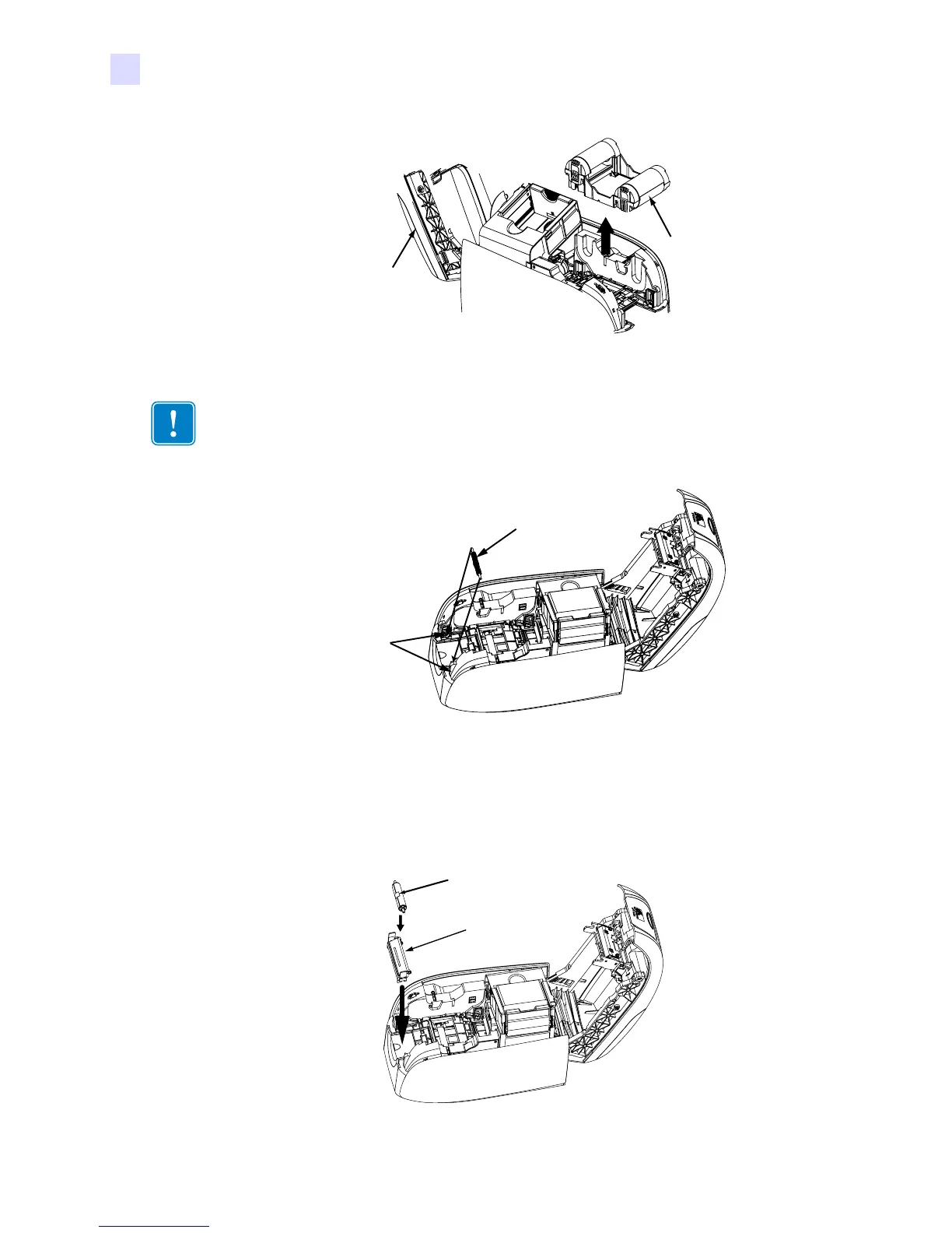 3. Install the black roller from the Single Card Feed Kit into the blue tabs at the front of the