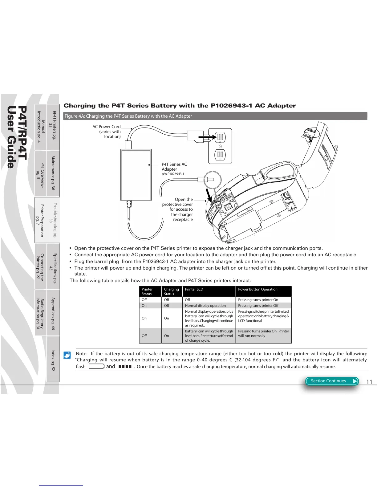 Figure 4A: Charging the P4T Series Battery with the AC Adapter