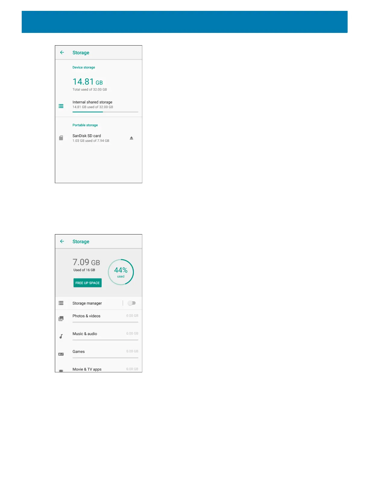 • Internal Storage - Displays the total amount of space on internal storage and amount used.