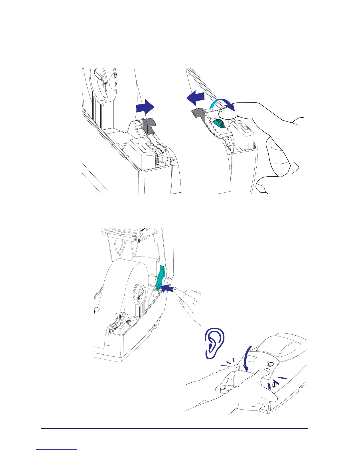 8. Close the printer. To lower the top cover, first press the top cover’s latching stand towards