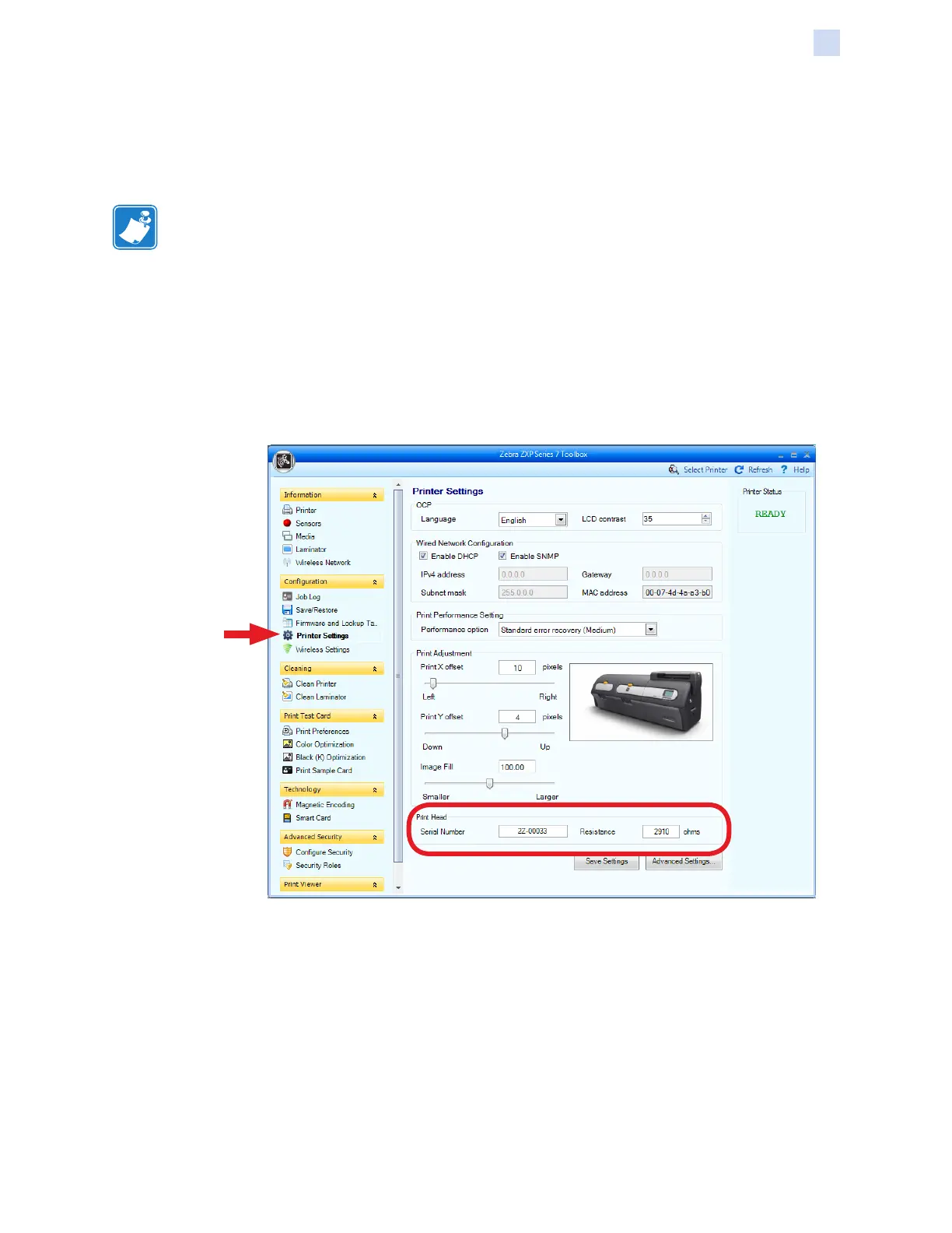 Step 3. In the Printhead > Serial Number and Resistance fields (circled above),