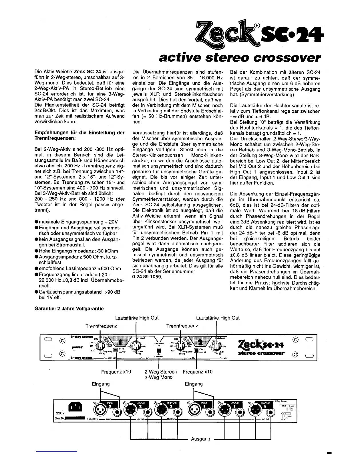 Zeck Audio SC24 - Crossover Operation and Settings; Frequency Setting Recommendations; Input;Output Connectivity and Features; Operating Mode Selection