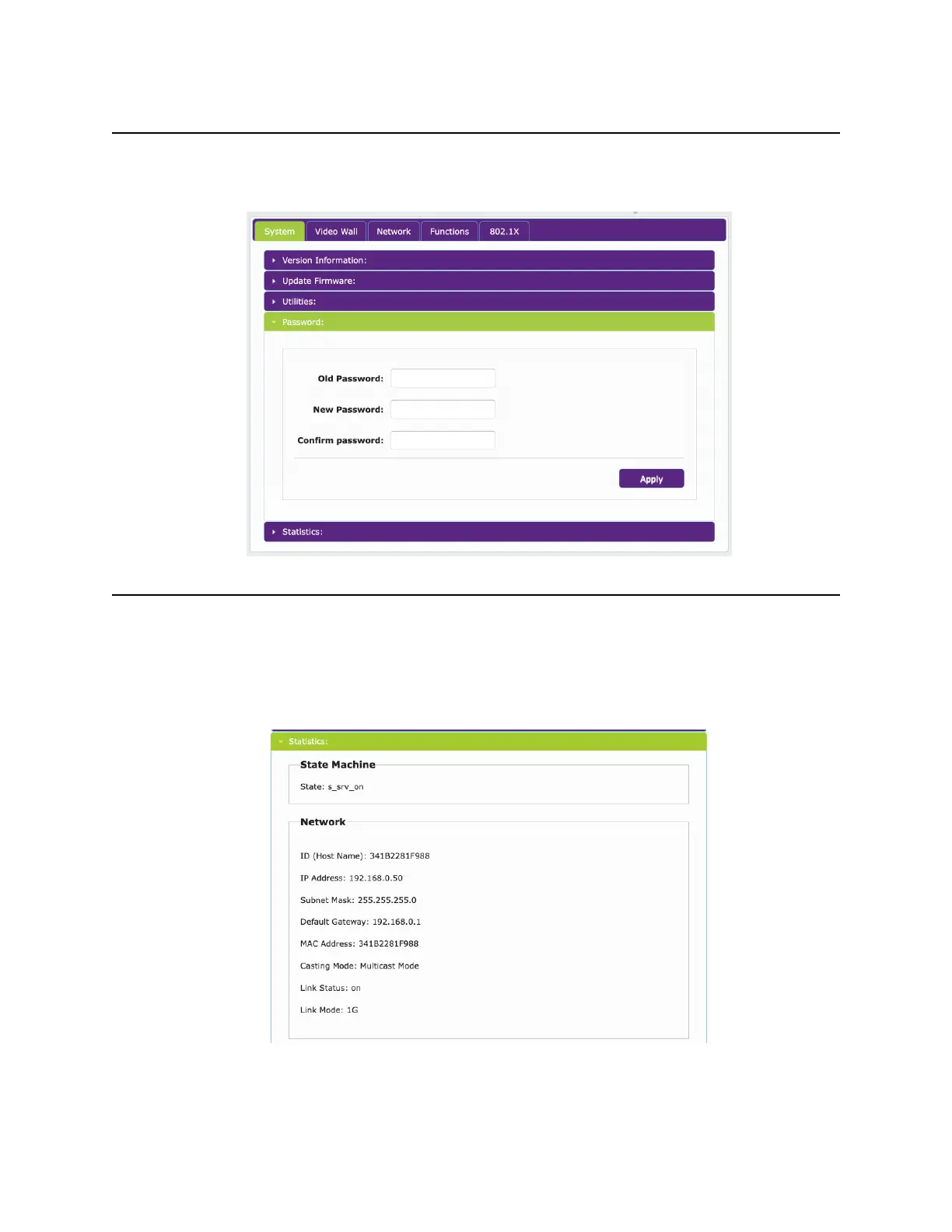 This includes current IP address, MAC address, Status, Output information from a decoder,