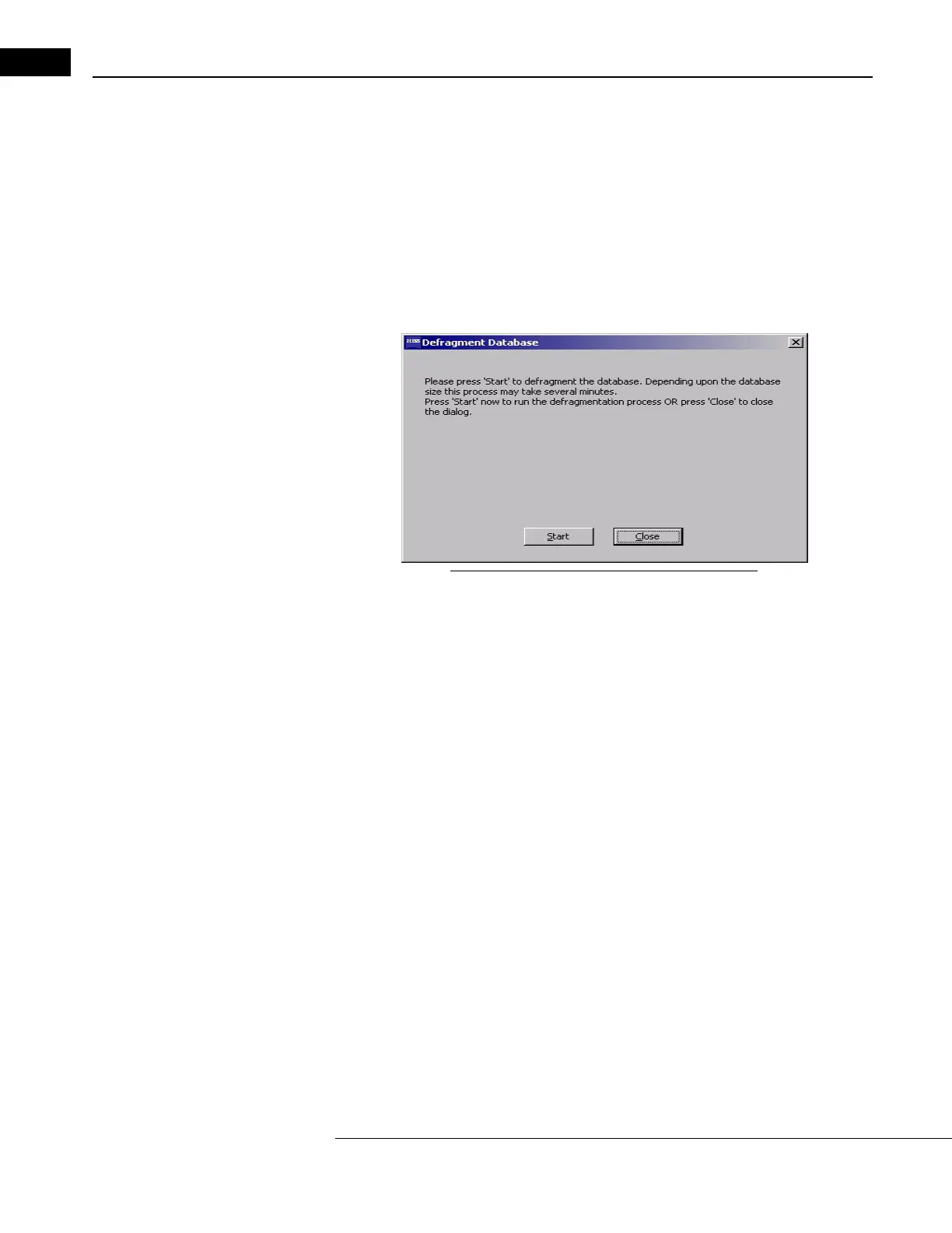 2. Click Start. The DEFRAGMENT DATABASE WINDOW will show the progress of