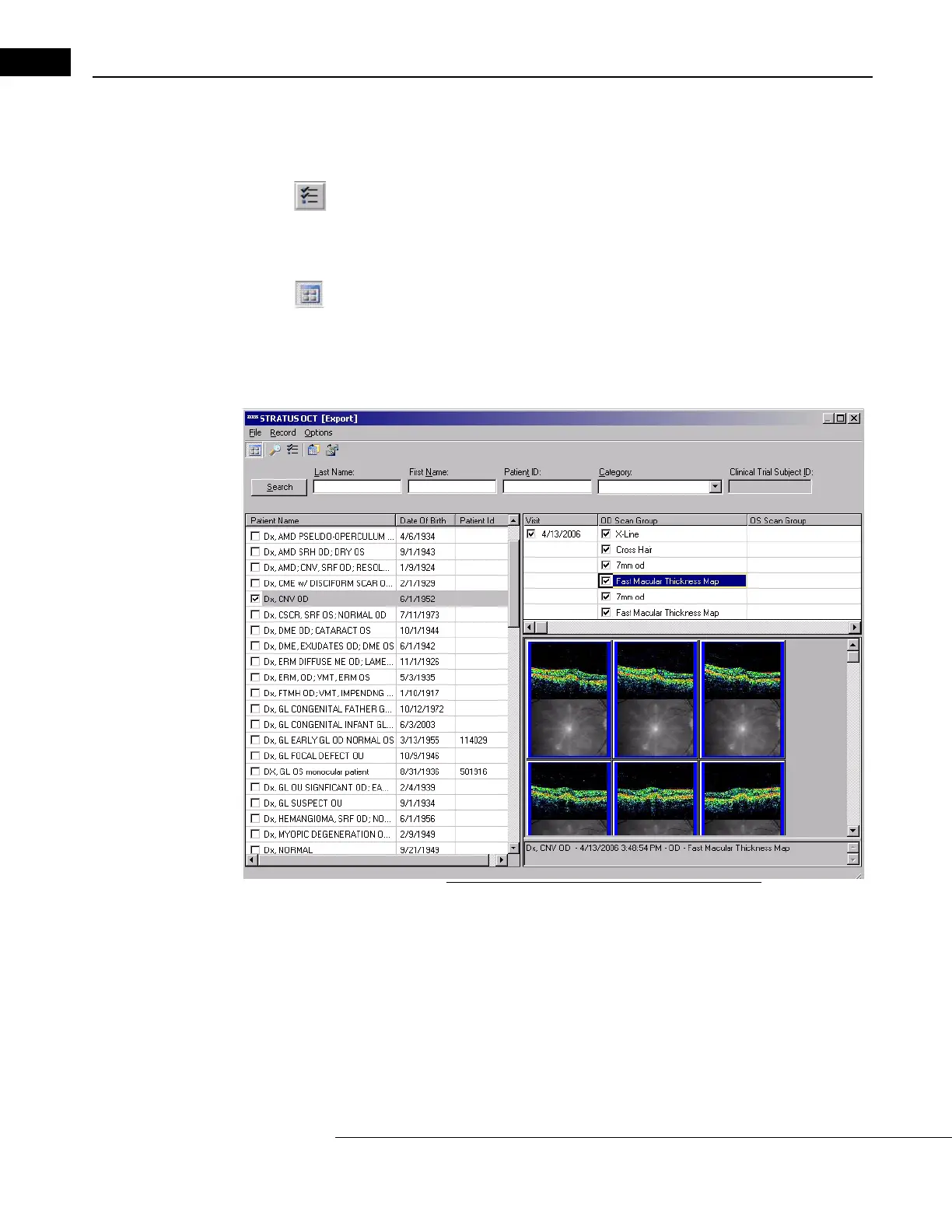 select a patient, all their visits and exams appear and are selected by default. Deselect