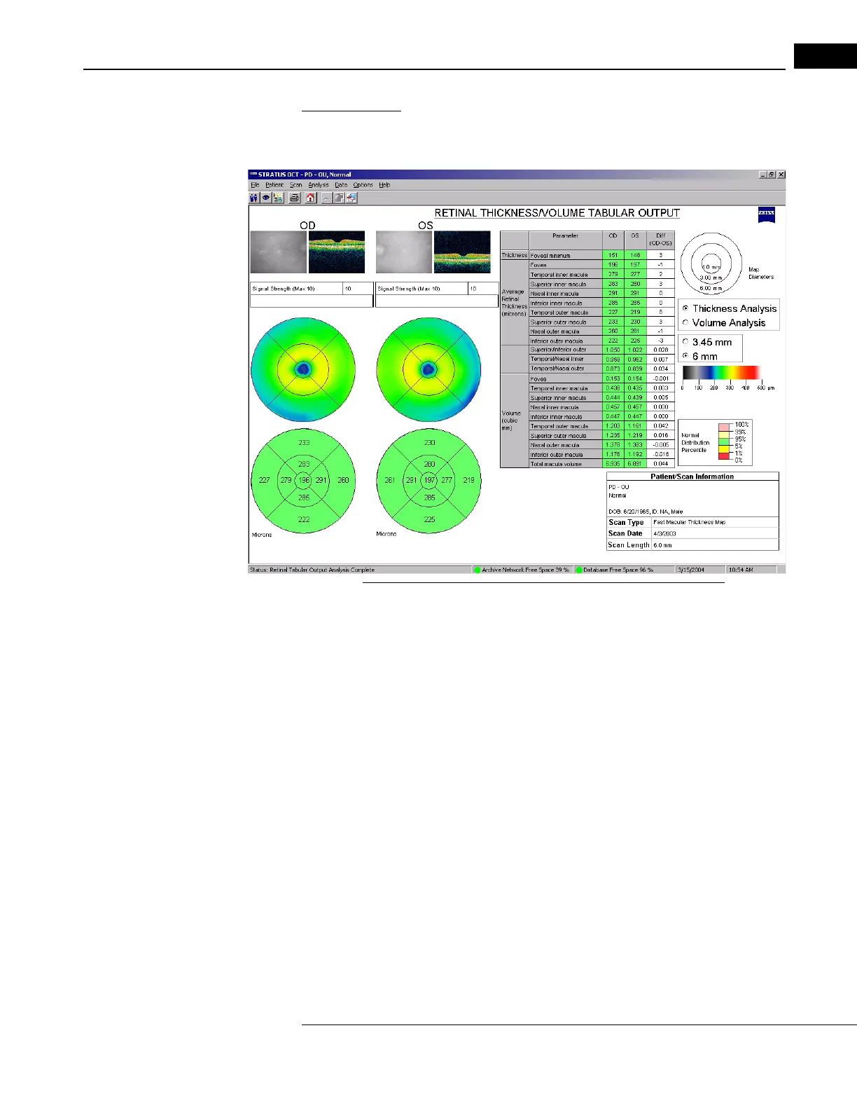The output display includes all the elements of the Retinal Thickness/Volume analysis