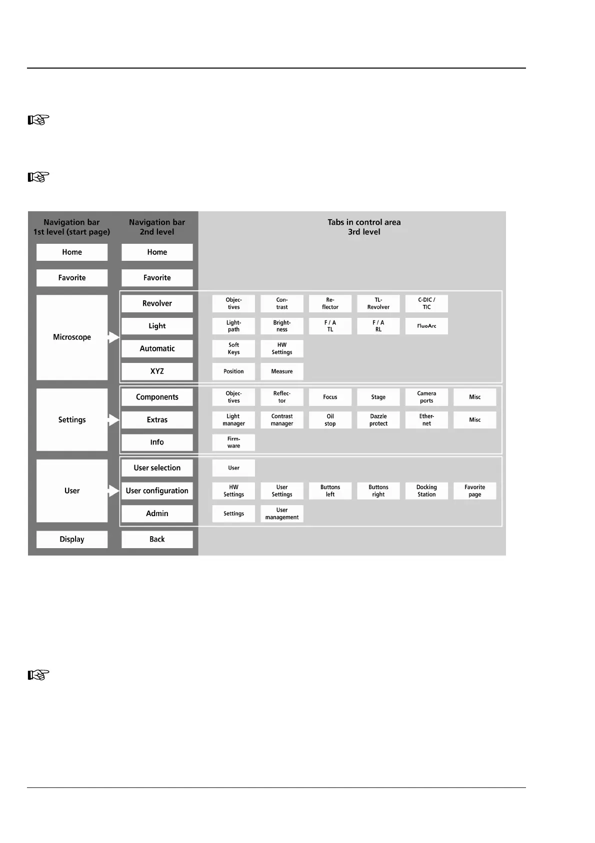 Depending on the microscope configuration, the actual menu structure may deviate from the