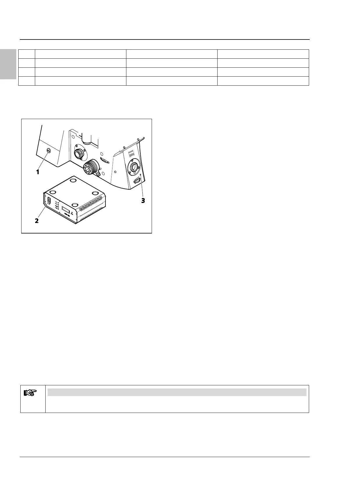 The monitoring LED (Fig. 3/3) lights up when the microscope is switched on.