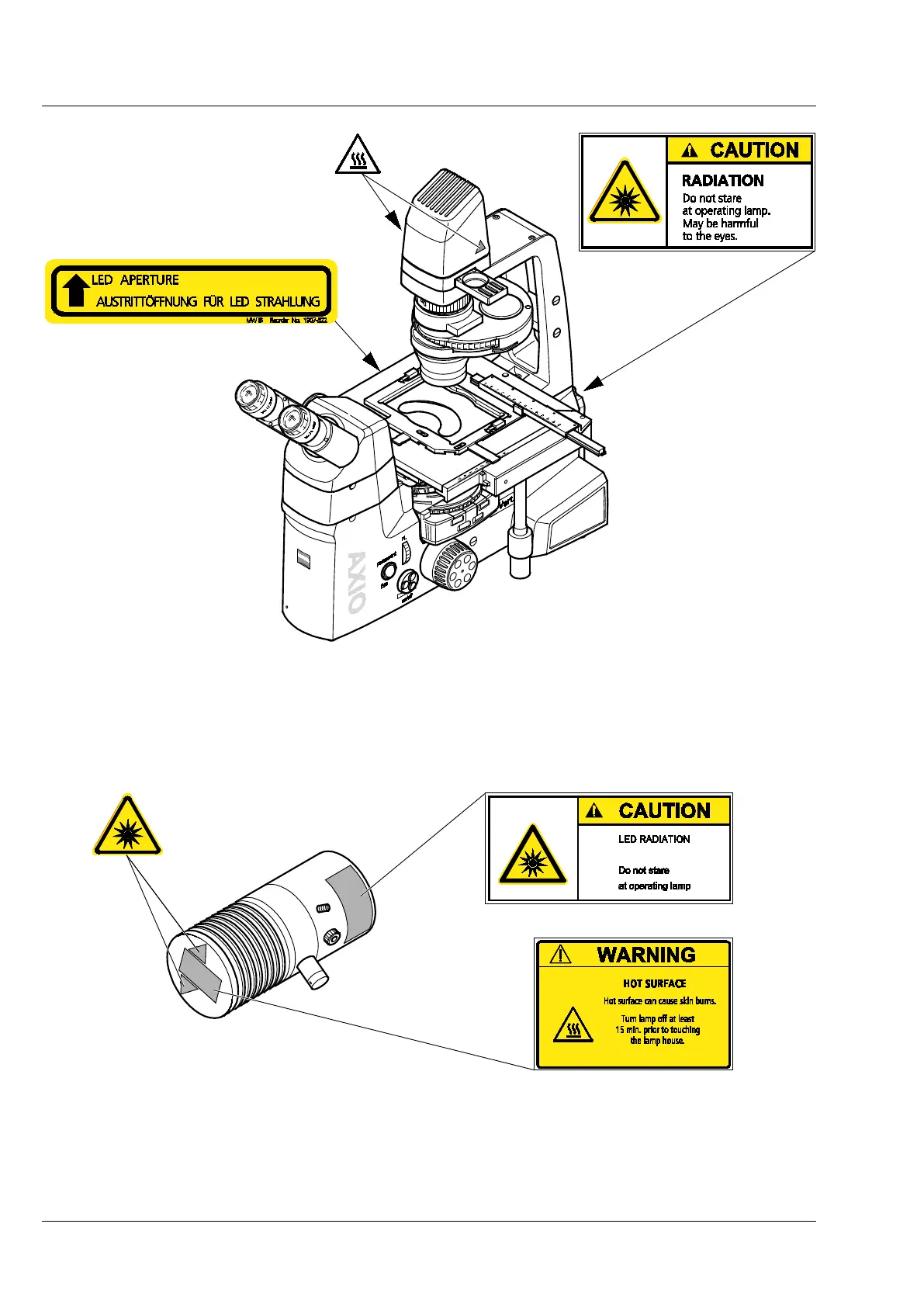 Zeiss Axio Vert.A1 - Fig. 1-2 Warning Labels on the Axio Vert.a1 FL-LED Stand; Fig. 1-3 Warning Labels on the VIS-LED (423053-9030-000)