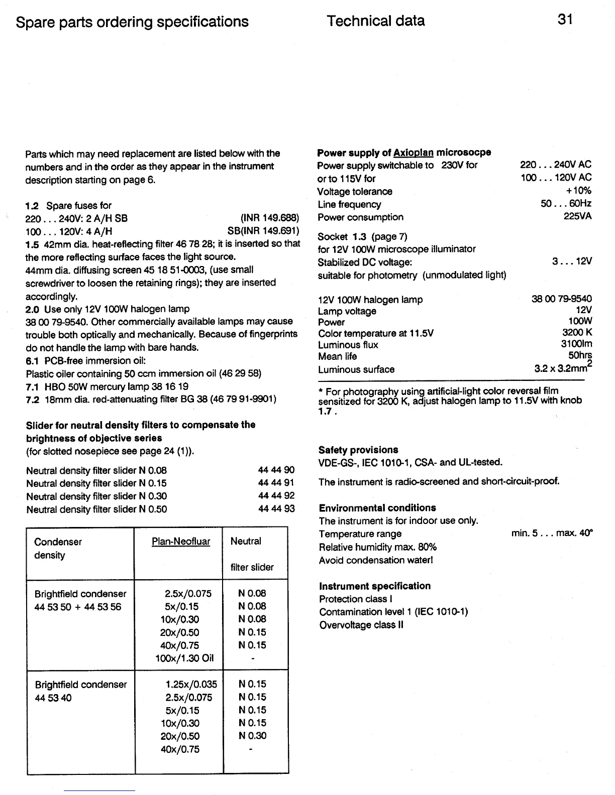 Zeiss Axioplan Universal microscope - Spare Parts; Technical Data