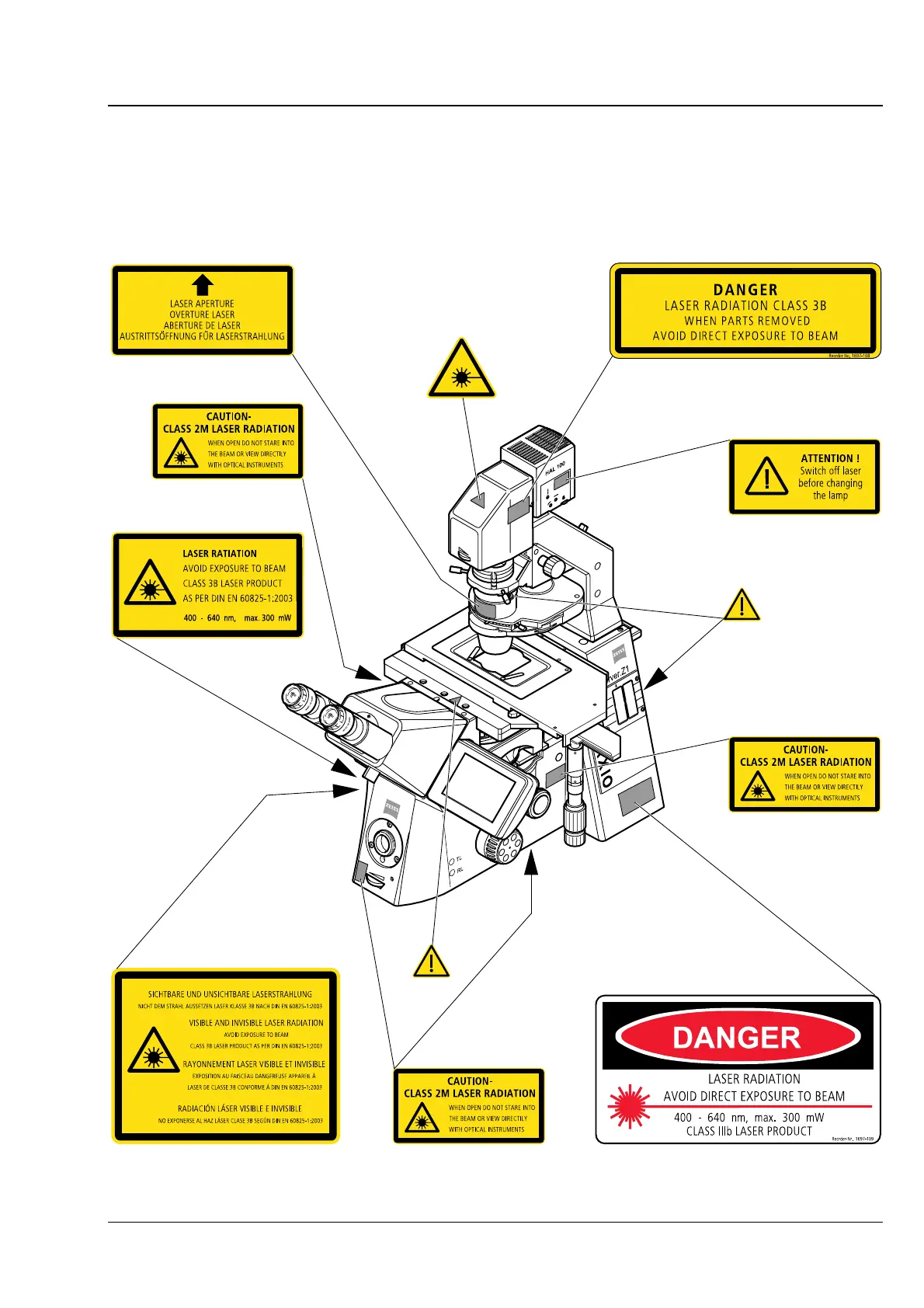 Fig. 1-3 Warning and information labels at the Axio Observer.Z1 microscope