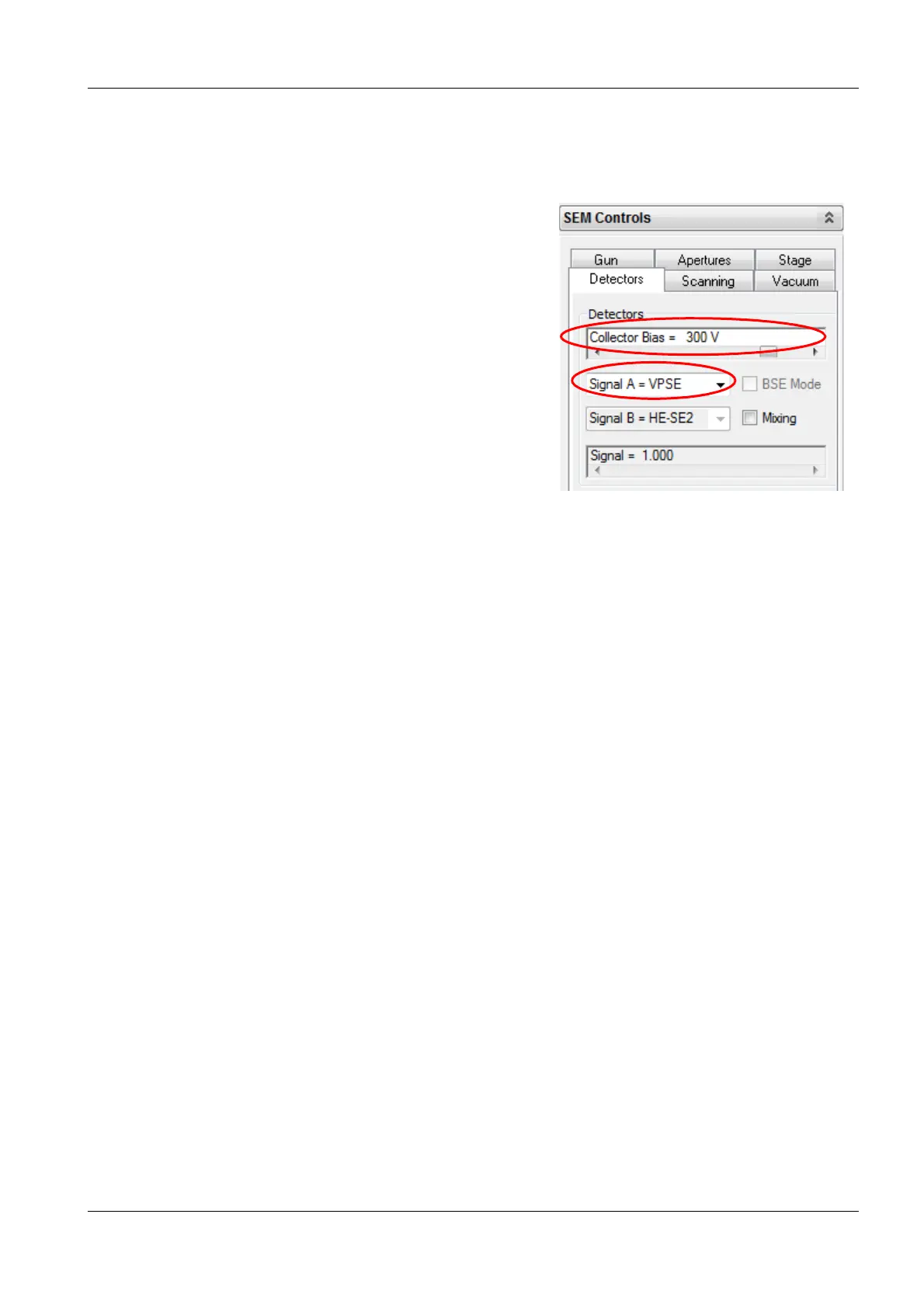 2 In the Detectors tab of the SEM Control pan-