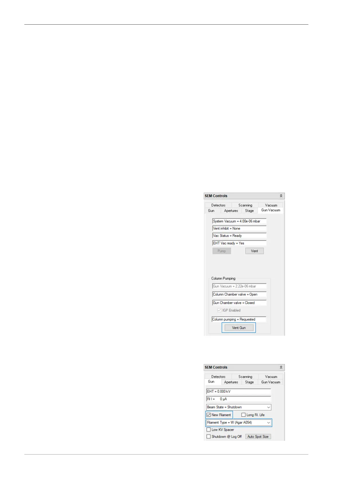 1. In the SEM Controls panel, select the Gun Vacuum tab.