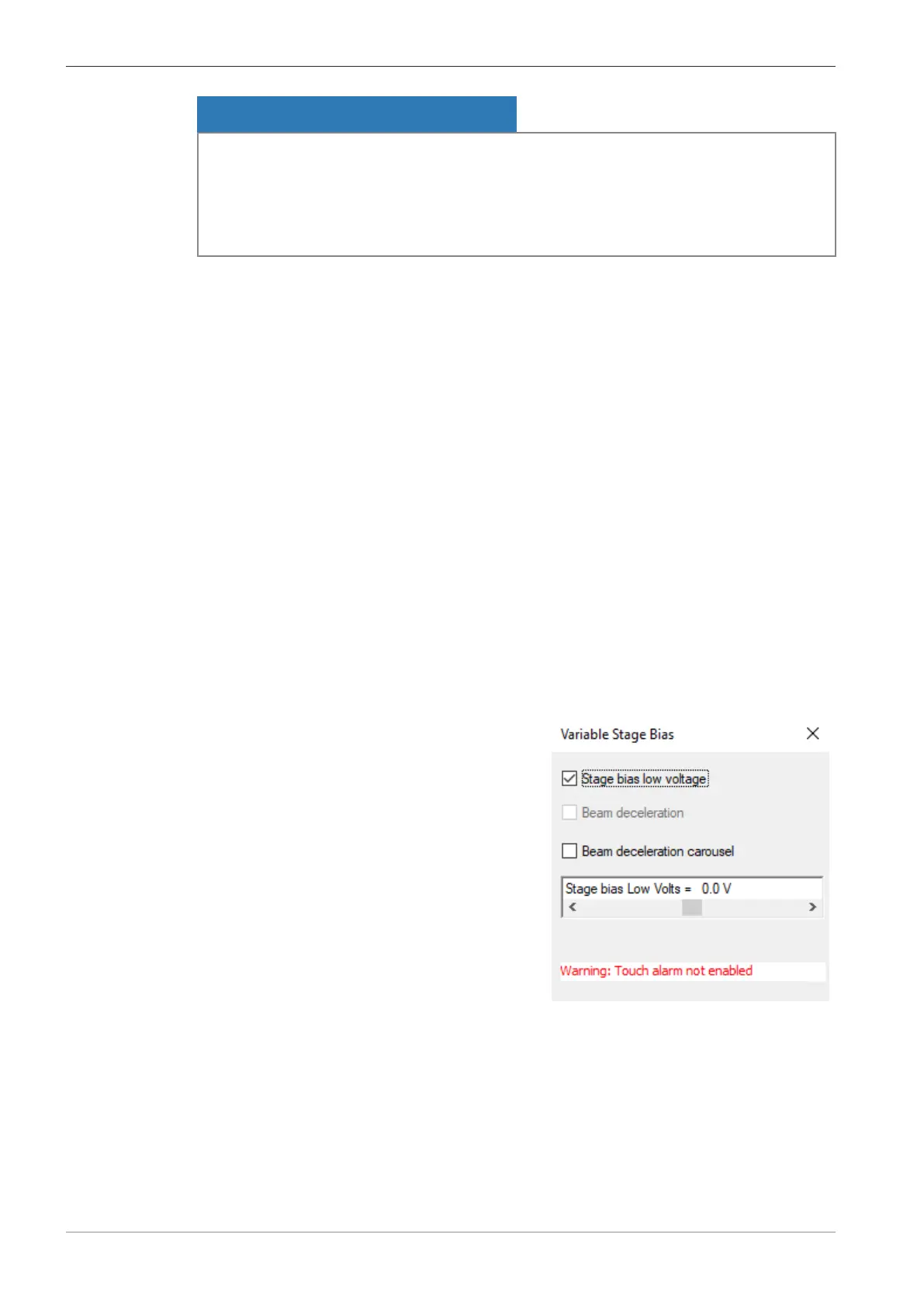 When beam deceleration or stage bias is activated, the stage touch alarm is automatically de-