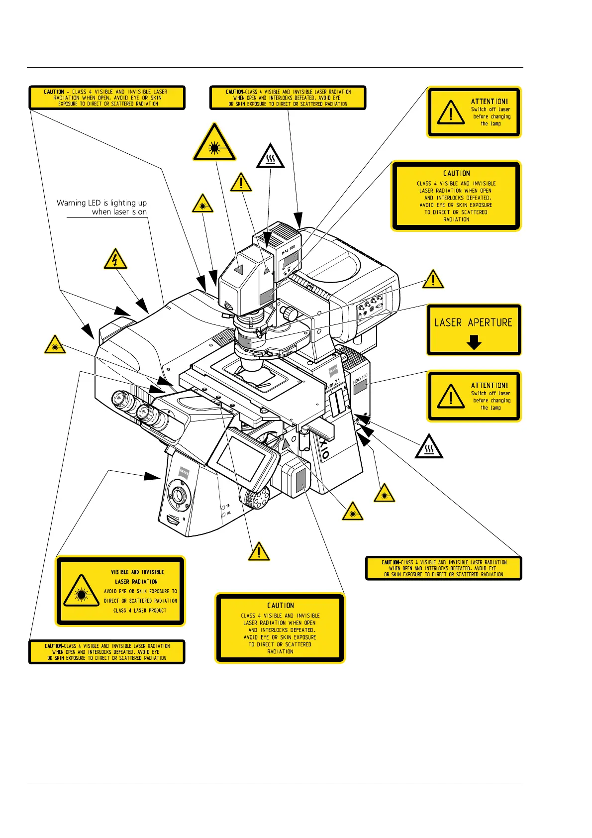 Fig. 8 Warning and information labels on the Axio Observer.Z1 microscope with the