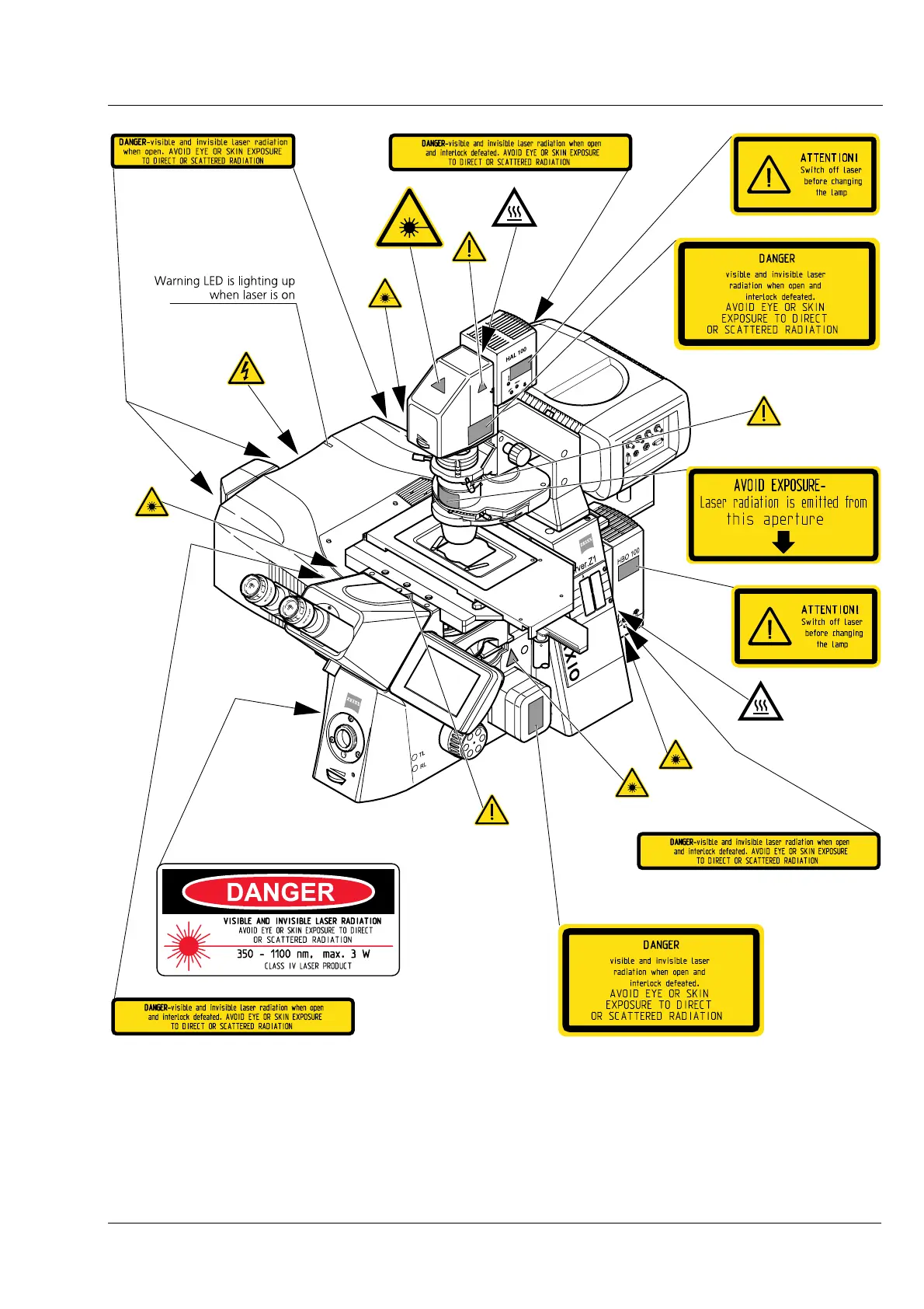Fig. 9 Warning and information labels on the Axio Observer.Z1 microscope with the
