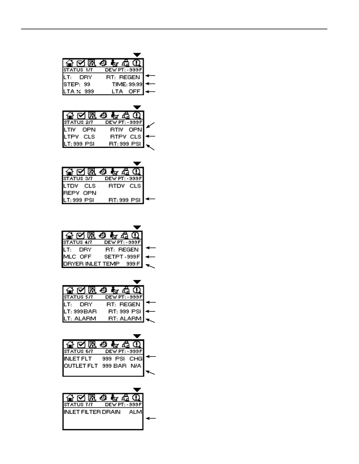 LT, RT: Indication of Left Tower and Right Tower Pressure (PSI) when dryer