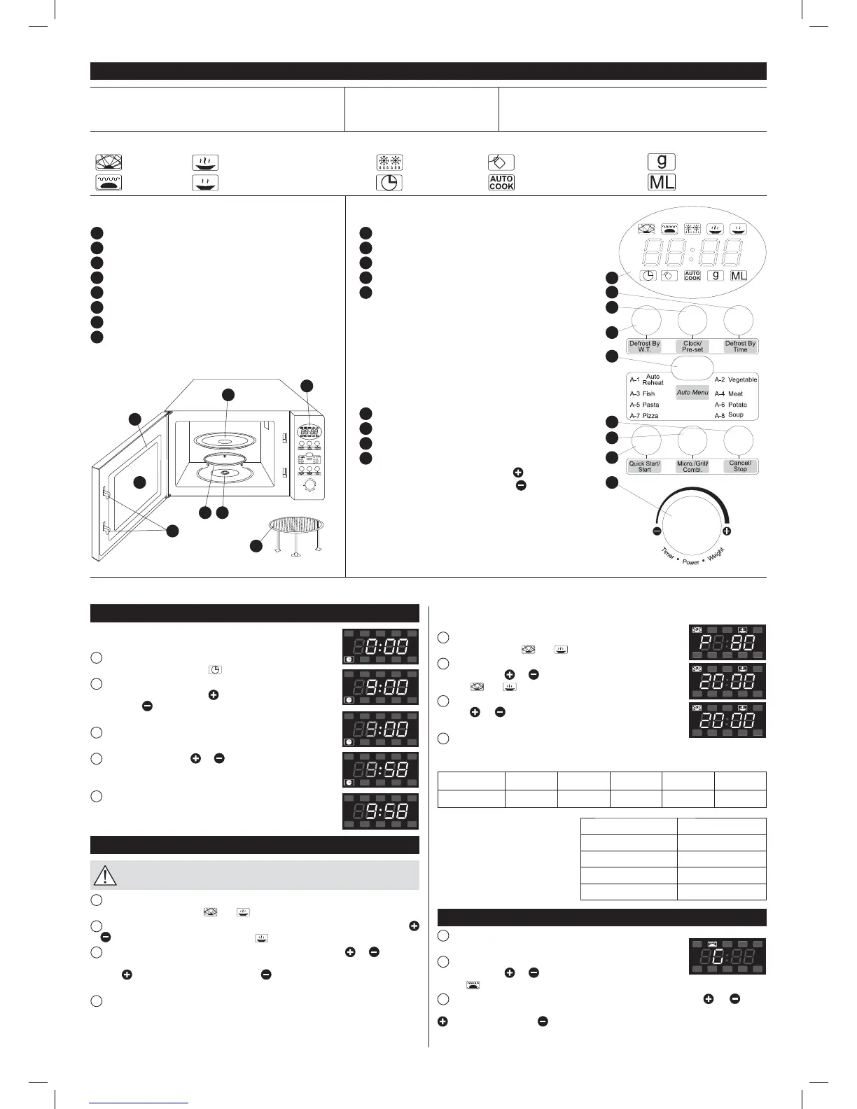 Grill Very low and low power Clock Automatic cooking Capacity in ml