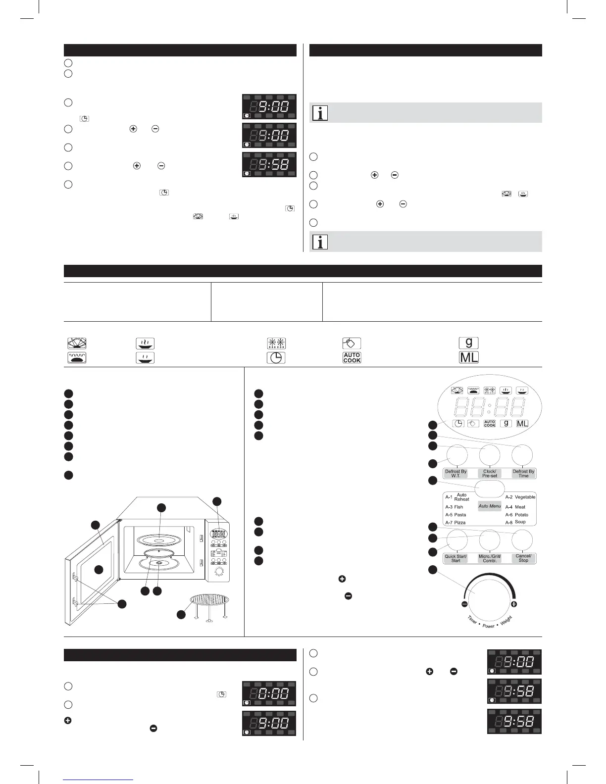 Mикроволны Мо щность очень высокая и высокая Размораживание Блокада для защиты от детей Вес в граммах