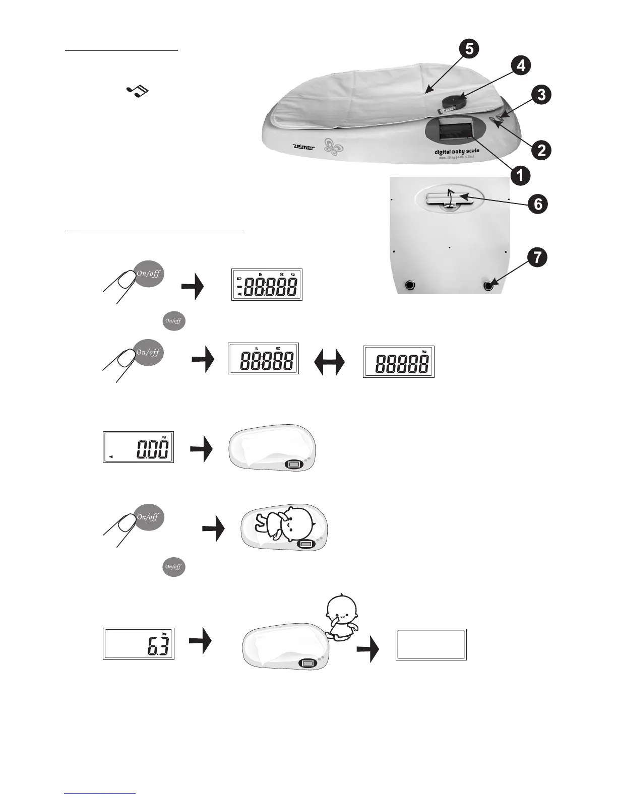 Stlačte tlačidlo s cieľom vynulovať váhu a položte dieťa na plachtičku, na váhu, keď