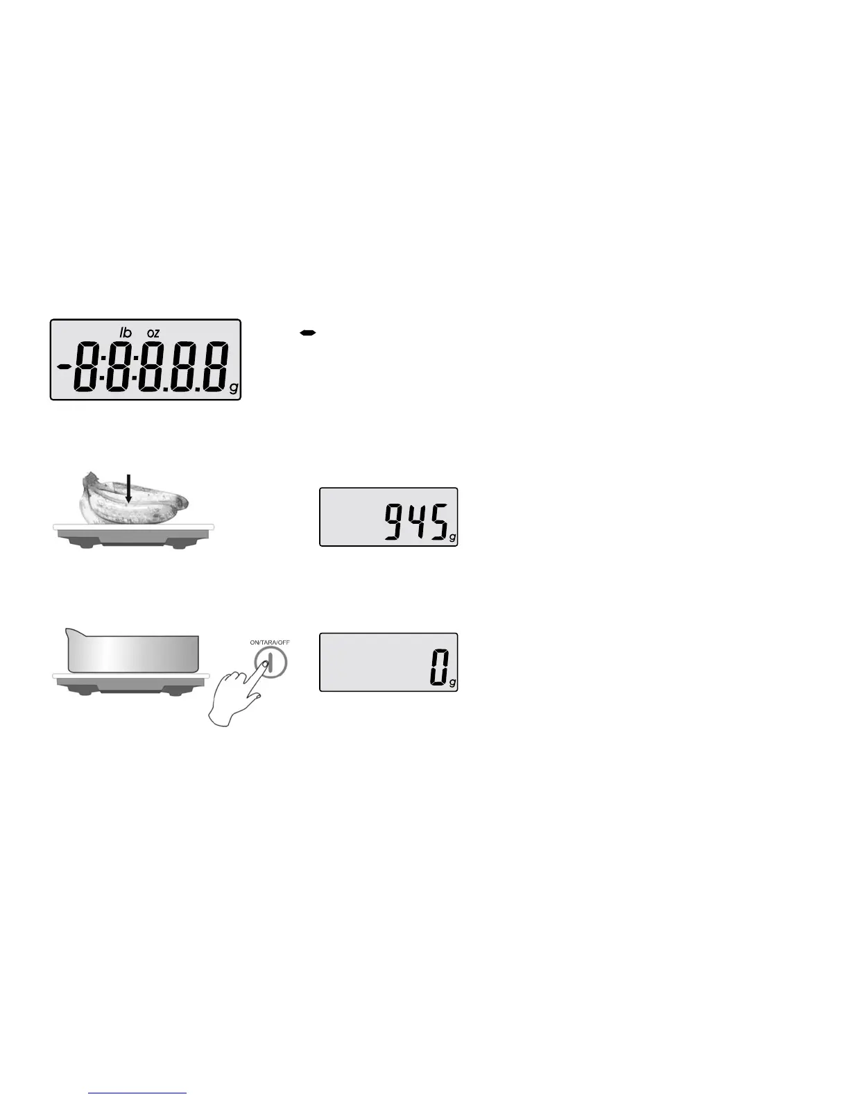przycisk ON/TARA/OFF (3), aby wyzerować wagę. Następnie włóż produkty do pojemnika, aby uzyskać ich wagę.