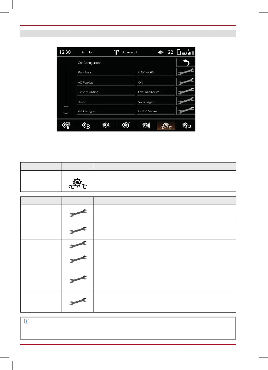 In this menu you can make all the settings specific to the car. You will find an explanation of the