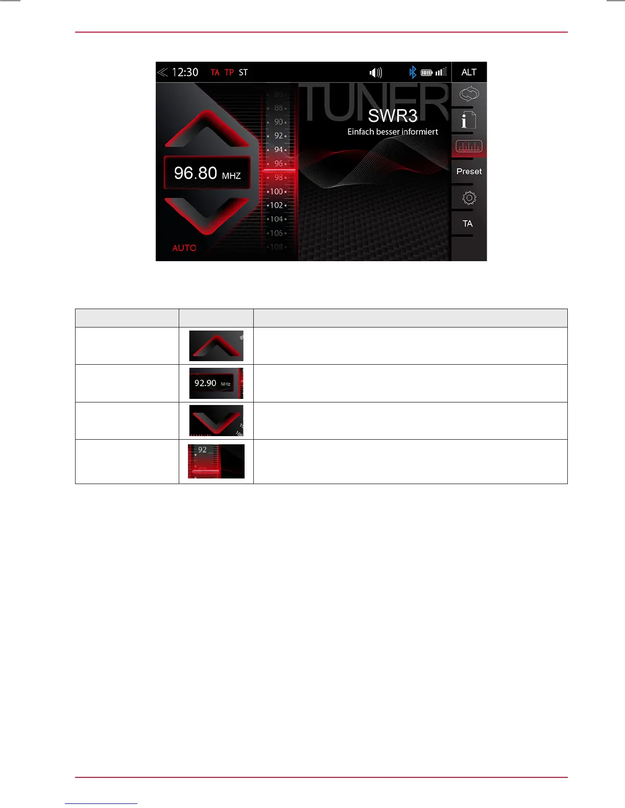 frequency arrows: manual steps in 100kHz, or auto scan (stopping at next station). See page 18.