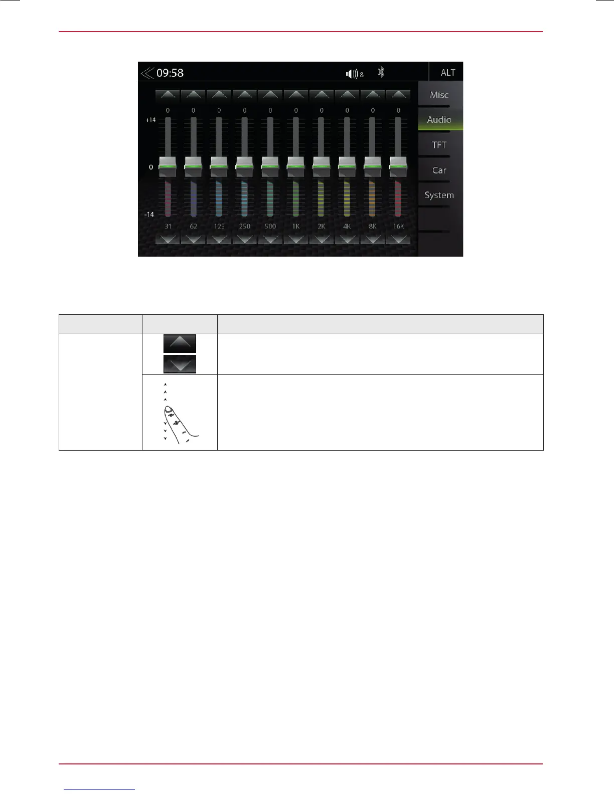 In this Expert Mode menu page, you can set the 10-band graphical equalizer. Press and hold the indi-