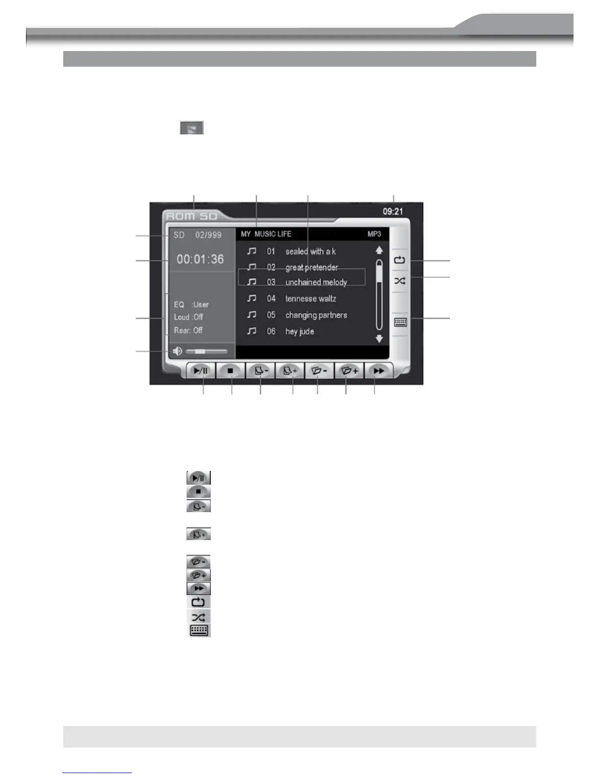 15. SD card indicator, display the cu rrent track and total number of tracks