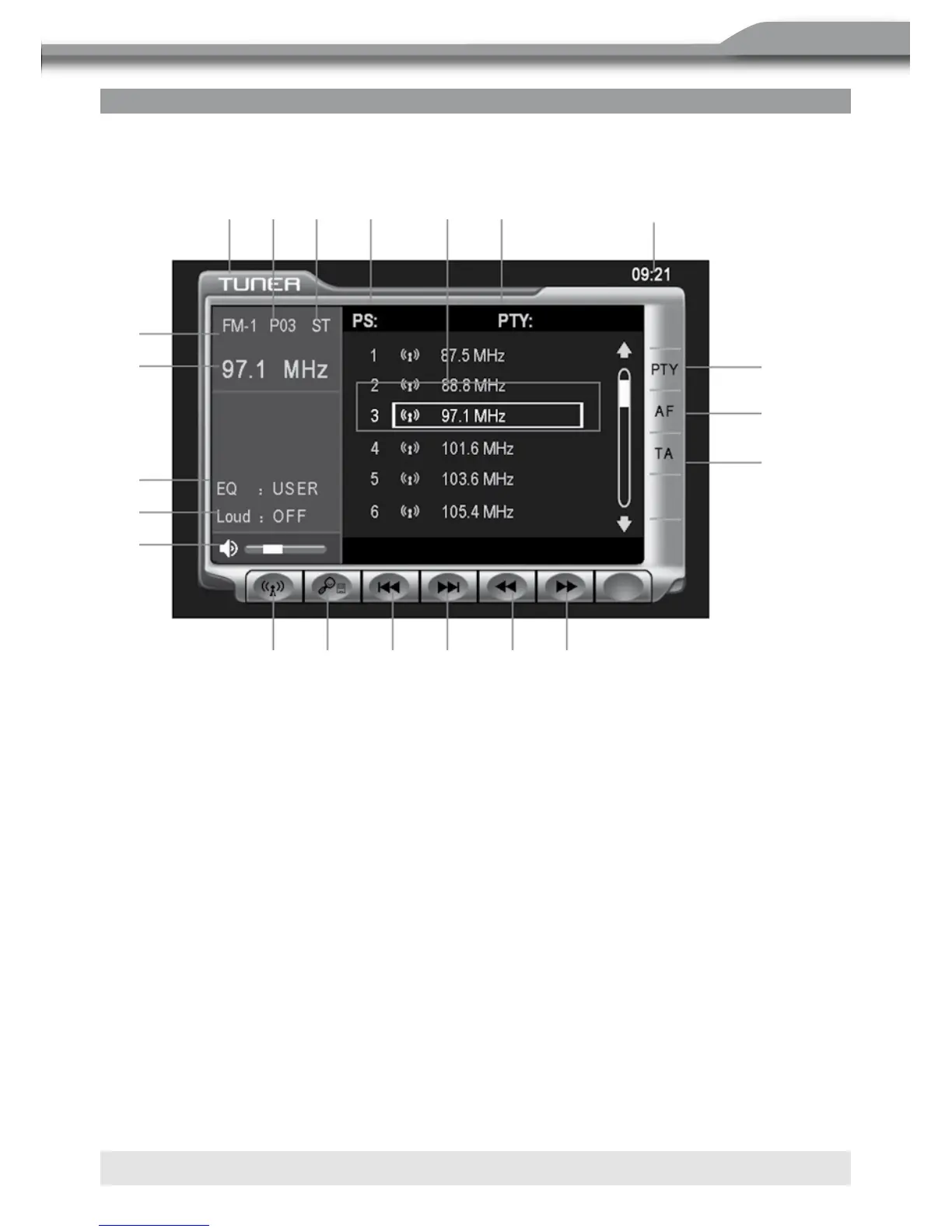 10. Program type (PTY) indicator: Touch to activate/deactivate PTY function.