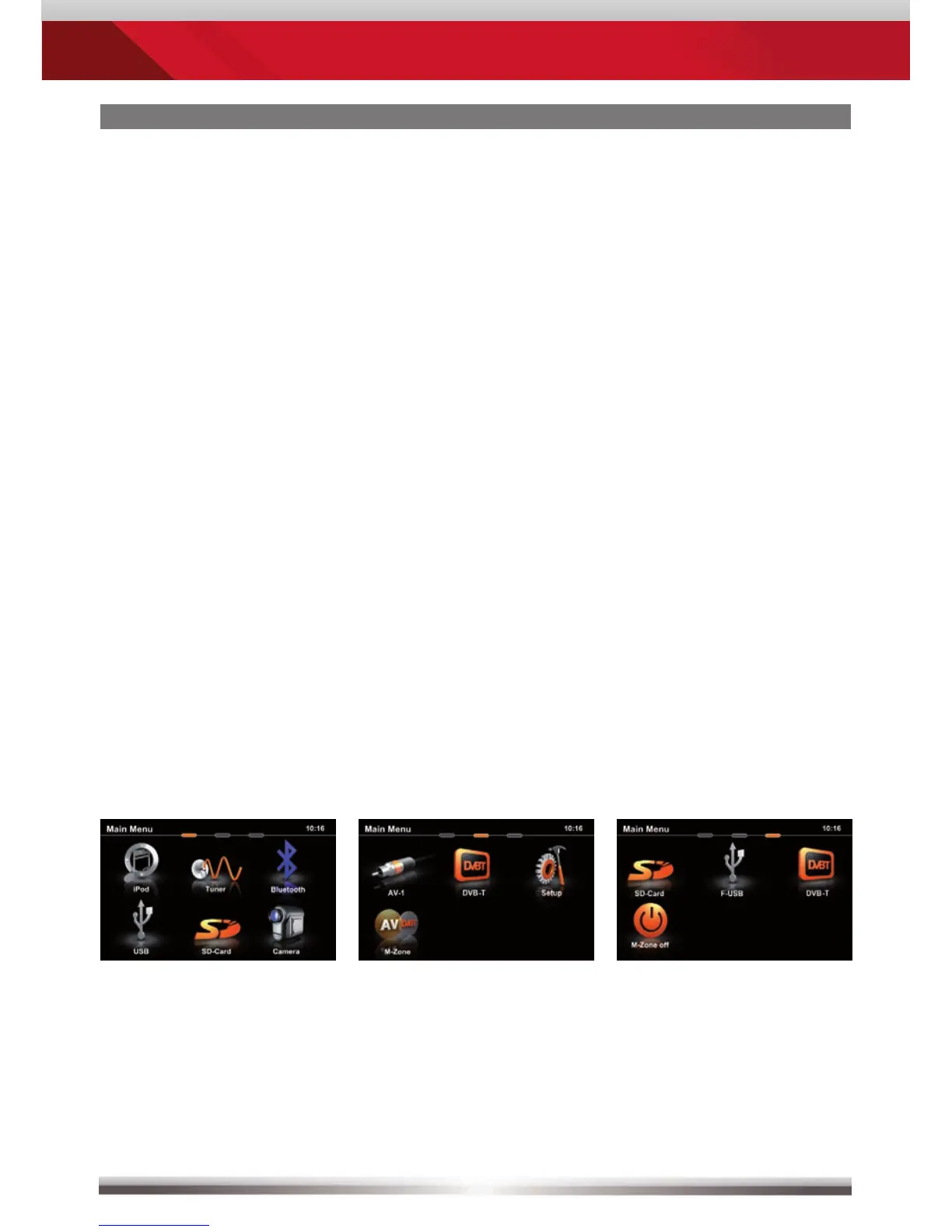 The main menu consists of three pages: Two main pages and one M-Zone page.