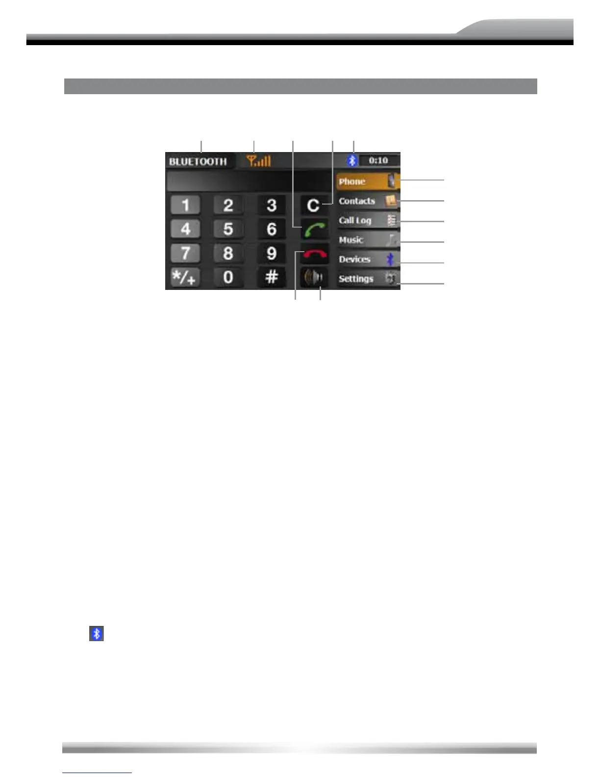 1. Current playing source: Bluetooth. Touch to go back to the main menu.