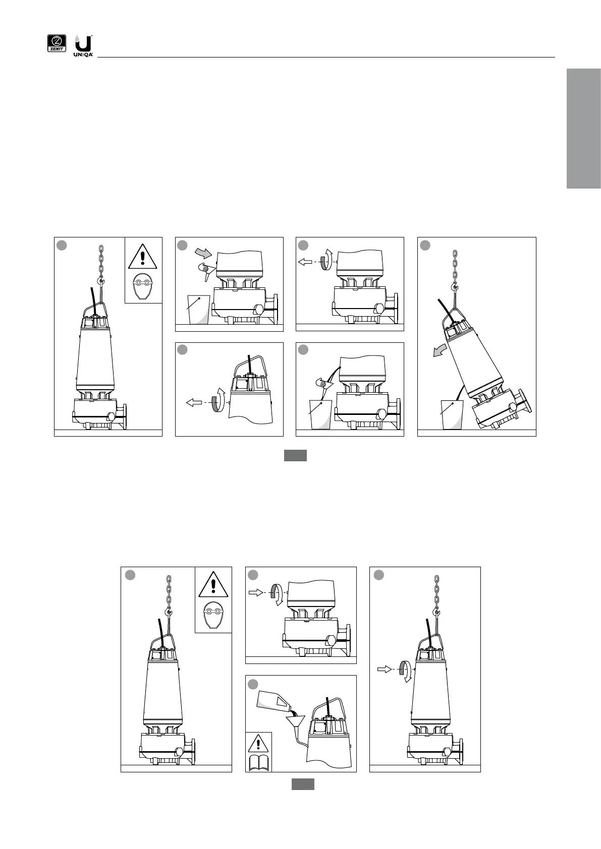 2. Assicurare la pompa con una catena o fune di dimensioni adeguate agganciata alla maniglia superiore per evitare cadute accidentali;