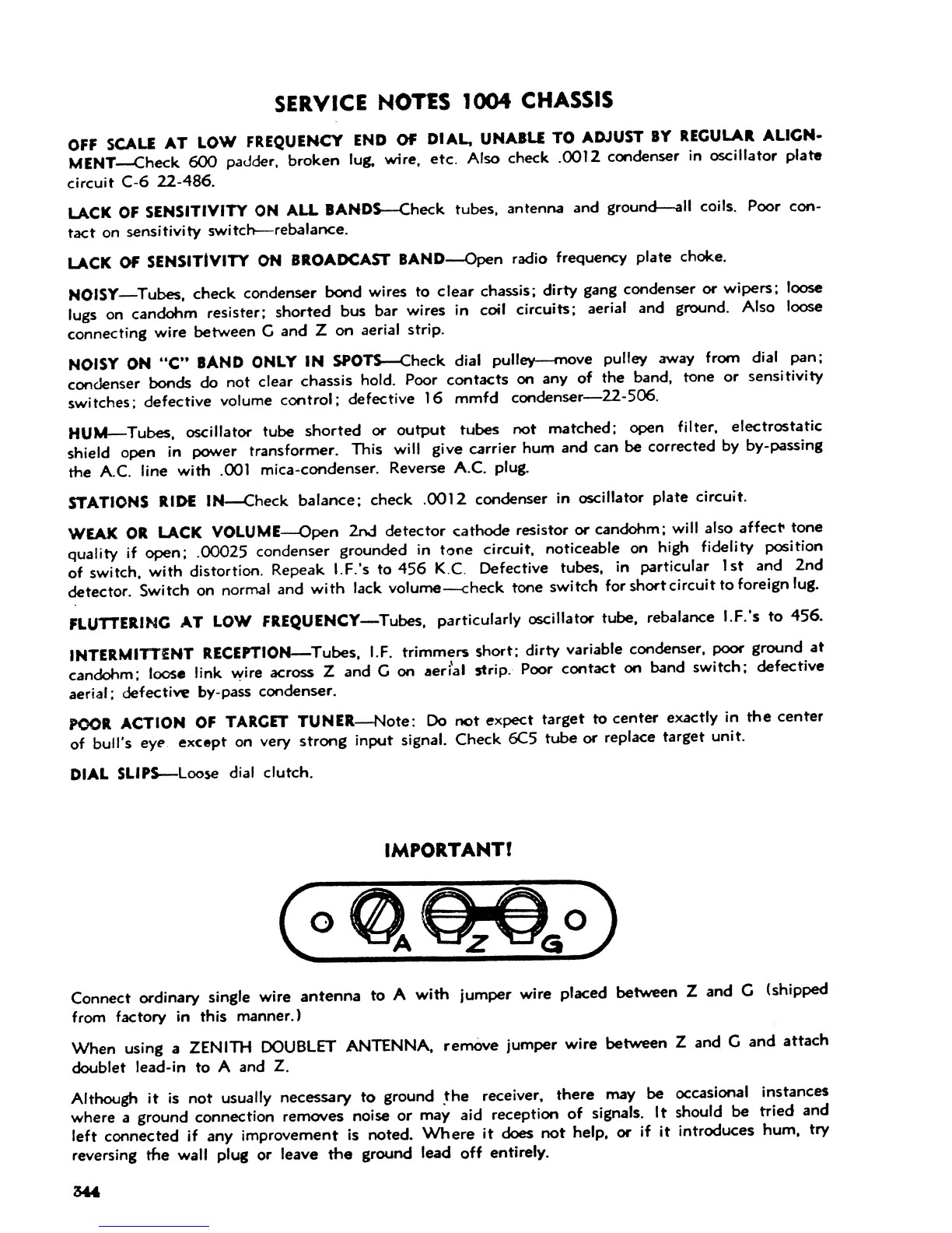 Zenith 1937 - Service Notes and Troubleshooting; Service Notes for 1004 Chassis; Important Antenna Information