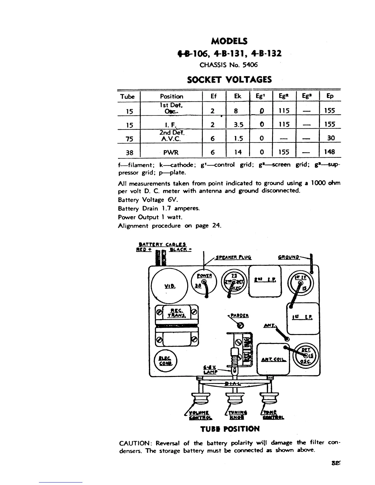 Zenith 1937 - Socket Voltages and Tube Positions; 4-B-106, 4-B-131, 4-B-132 Socket Voltages