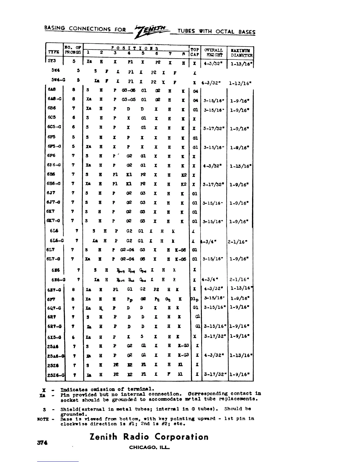 Zenith 1937 - Tube Basing Connections for Octal Bases