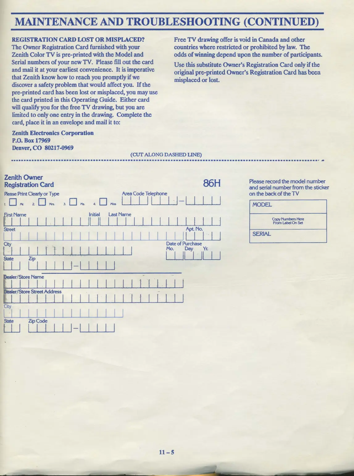 Zenith Color TV is pre-printed with the Model and