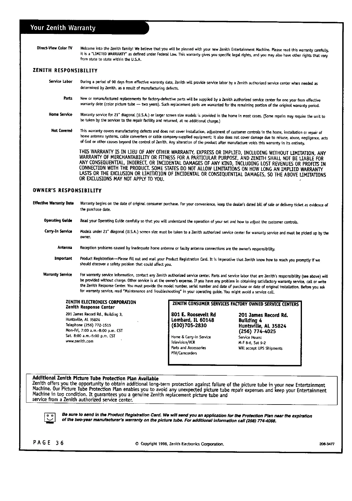 P A G E 3 6 © Copyright 1998, Zenith ELectronicsCorporation. 206-3477