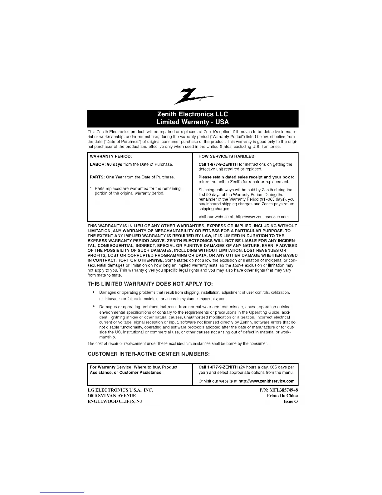 This Zenith Electronics product, will be repaired or replaced, at Zenith's option, if it proves to be defective in mate-