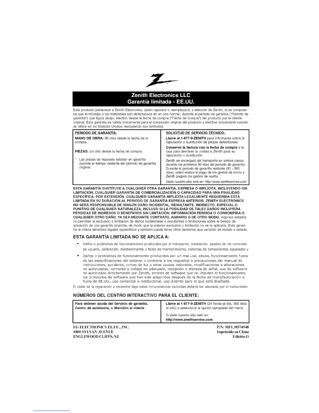 Este producto pertenece a Zenith Electronics, quien repararb, o reemplazarb., a elecciOn de Zenith, si se comprue-