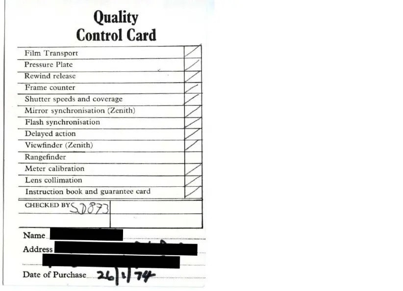 Zenith E - Zenith Camera Quality Control; Quality Control Card Details