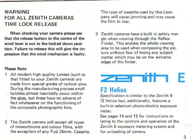 Zenith E - Zenith Camera Operation and Handling; Important Warnings and Notes