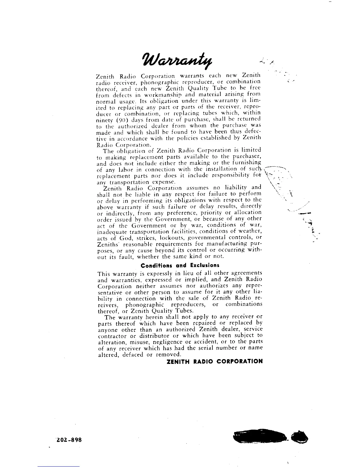 Zenith H723Z1 - Warranty; Conditions and Exclusions