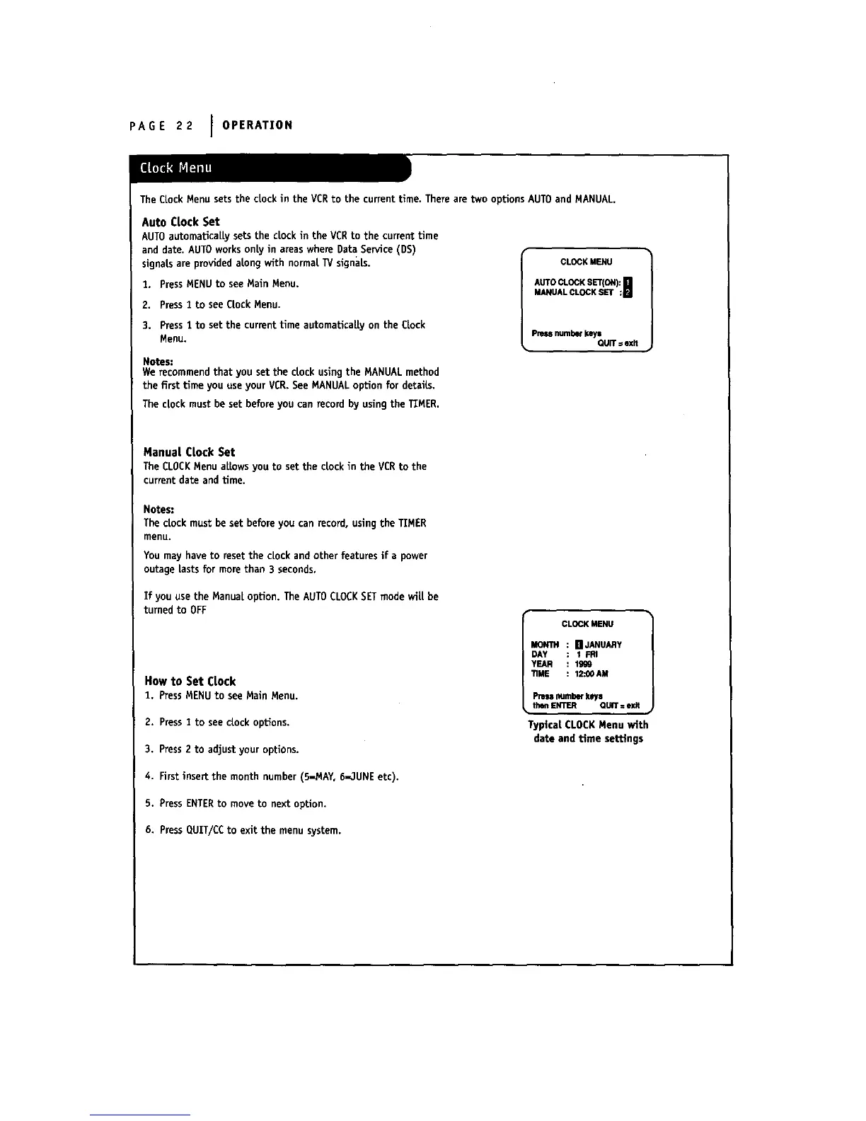 The Clock Menu setsthe clock in the VCRto the current time. There are two options AUTOand MANUAL,